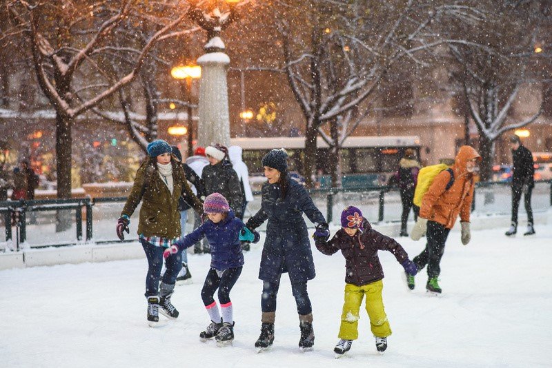 As pistas de gelo de Chicago normalmente ficam abertas de novembro a março, se o tempo permitir. O aluguel de patins está disponível.